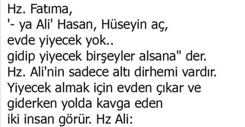 Hz. Fatıma, ‘- ya Ali’ Hasan, Hüseyin aç, evde yiyecek yok.. gidip yiyecek birşeyler alsana” der. Hz. Ali’nin sadece altı dirhemi vardır. Yiyecek almak için evden çıkar ve giderken yolda kavga eden iki insan görür. Hz Ali: “Niçin kavga ediyorsunuz? Şu âlemde Allah’ı düşüneceğiniz yerde niçin birbirinizle mücadele ediyorsunuz?” diye sorar. Kavga edenlerden biri, diğerinden
