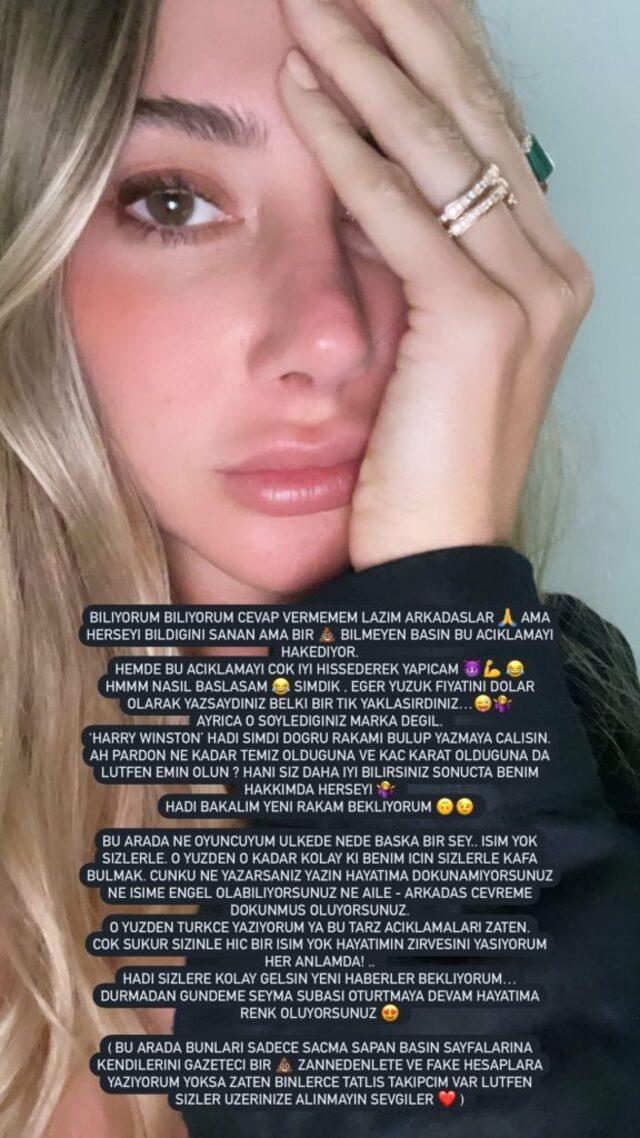 Sosyal medya hesabından yaptığı paylaşımda magazin basınını hedef alan Şeyma Subaşı, “Bir cevap vermemem lazım ama her şeyi bildiğini sanan ancak bir şey bilmeyen basın bunu hak ediyor diye başladığı açıklamasında, “Eğer yüzüğün fiyatını dolar olarak yazsaydınız belki bir tık yaklaşırdınız, ayrıca o söylediğiniz marka da değil. Harry Winston hadi şimdi doğru fiyatı bulup yazmaya çalışın. Ah pardon ne kadar temiz olduğuna ve kaç karat olduğundan da emin olun. Hani siz daha iyi bilirsiniz sonuçta benim hakkımda her şeyi. Hadi bakalım yeni rakam bekliyorum” demişti.