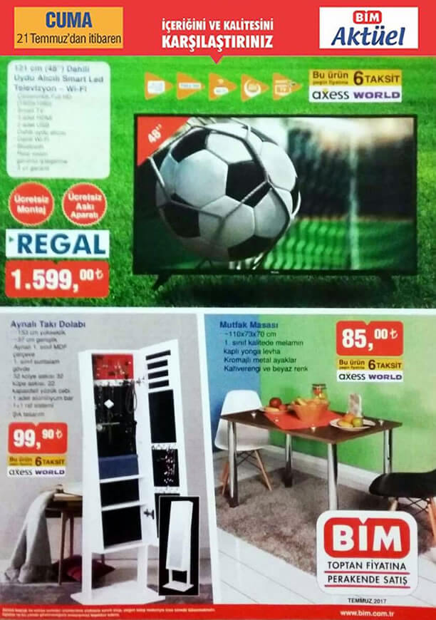 Bim Aktüel Ürünler bu broşür sayfasında yer alan Regal Smart Led Tv, Aynalı Takı Dolabı ve Mutfak Masası Axess ve World kredi kartı sahiplerine peşin fiyatına 6 taksit imkanı ile sunuluyor. Bim’de bu hafta satışa sunulan Mutfak Masası 110x73x70cm ölçülerine sahipken Aynalı Takı Dolabı özelliklerine baktığımızda 153cm yüksekliğinde 37cm genişliğinde olduğunu görüyoruz.