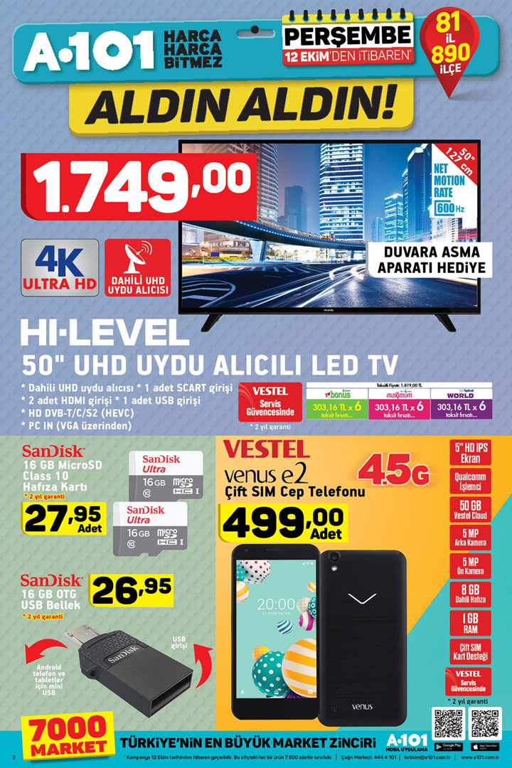 A101 12 Ekim tarihinde geleceği duyurulan haberler ve sosyal medya söylentilerine göre incelemelerimiz başlıyor. Bu hafta yani 12 Ekim 2017 tarihinden itibaren A101 markette; Hi-Level 50” UHD uydu alıcılı LED Tv sizlerle olması bekleniyor. Bu ürün 4K yani ULTRA HD ekrana sahip ve dahili UHD uydu alıcısı da var. Bunun yanı sıra Vestel güvencesinde olan ürün tam 50’’ ekrana sahip. Yani 127cm ekrana sahip ürünün duvara asma aparatı da içinde… 2 adet HDMI girişine sahip ürün 1 adet SCART girişine ve PC girişi (VGA üzerinden) sahip… Taksit imkanları da olan ürün A101 ile 12 ekimde kaçmaz. Diğer bir üründe ise Vestel Venüs e2 çift sim cep telefonu var. Bu ürün de çift sim kart olması ile ve oldukça iyi teknik özellikleri ile cezbedici bir ürün… Diğer üründe ise SanDisk 16GB MicroSD Class 10 hafıza kartı var. Class 10 olması tercih sebebi olabilir. Güzel bir ürün ve ihtiyacı olan kaçırmamalı… Ayrıca bir başka hafıza ürünü olan SanDisk 16GB OTG USB bellek de sunulmuş. Tüm bu elektronik aletler – daha doğrusu teknolojik aletler – gösteriyor ki A101 yine istenileni fazlasıyla sunuyor. Teşekkürler A101 diyerek yeni sayfa incelemesi ile devam edelim.
