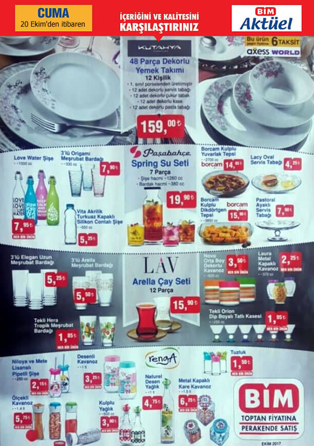 BİM Fırsatları incelememizde 20 Ekim 2017 tarihinden itibaren geçerli olacak bu broşür sayfasında 12 Parça LAV Arella Çay Seti, 7 Parça Paşabahçe Spring Su Seti ve Renga Metal Kapaklı Kare Kavanoz gibi ürünleri de görüyoruz.