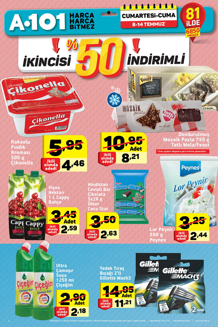 A101 8 Temmuz aktüel ürünlerinde bulunan ürünleri inceleyelim. Hafta sonu A101 bir başka… 8 Temmuz günü başlayan indirimleri 14 Temmuza dek sürdürecek olan bu markette bakalım neler var, görelim. Çikonella kakaolu fındık kreması 500gr ürünü ikili alımlarda indirimli olarak geliyor. Mola/ Feast dondurulmuş mozaik pasta 750gr tatlı da ikili alımlarda indirimli olarak sizlerle olacak. Cappy bahçe vişne nektarı ürünü de 1lt olarak ikili alımlarda indirimli olarak sunulmuş. Yaz günlerinde soğuk soğuk vişne suyu keyfi yapmak isteyenler için oldukça sevindirici bir haber… Coco Star Hindistan cevizli bar çikolata 5x28gr ürünü de indirimli olarak sunulmuş. Peynes lor peyniri 500gr ürünü de bu sayfada ikili alımlarda indirimli olarak yer almış. Çiçeğim ultra çamaşır suyu 1250ml ikili alımlarda indirimli olarak ve son olarak ise Gilette Mach3 yedek tıraş bıçağı 2li ürünü de ikili alımlarda indirimli olarak sizlerle oluyor. A101 market aktüel detaylarına değindik. Şimdi bir diğer hafta sonu kataloğu ile devam edelim.
