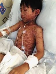 Daha sonra vücutta acılı, kırmızı veya mor döküntüler oluşuyor. Üst tabakadaki deri ölüyor ve dökülüyor. 10 yaşındaki çocuk 3 hafta boyunca bilinçsiz bir şekilde yattıktan sonra antibiyotik tedavisine cevap vermeye başladı. Ateşlendikten 1 ay sonra ancak uyanabildi.