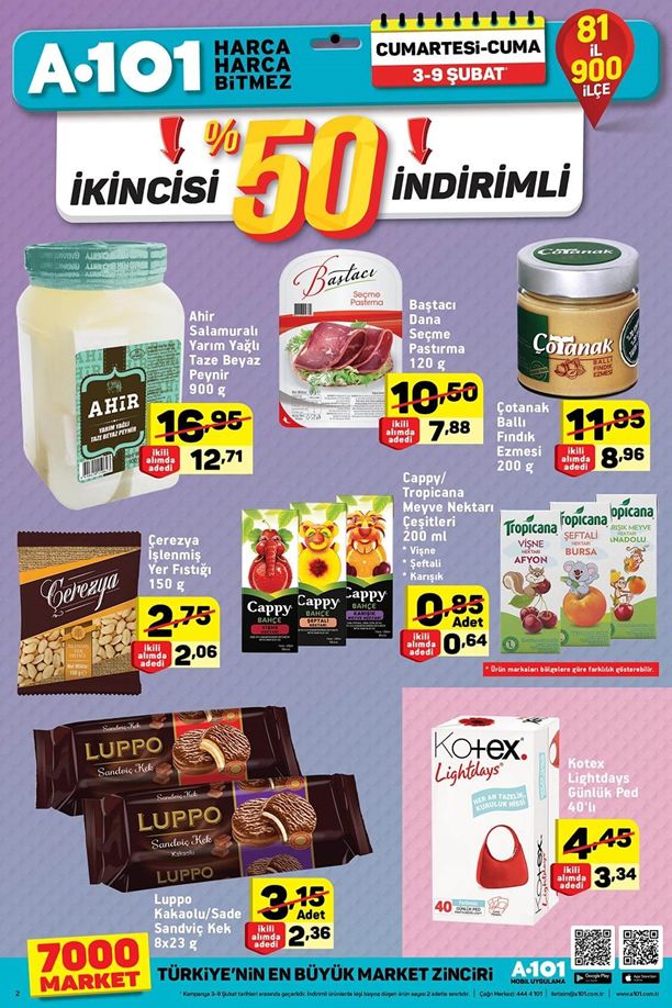 A101 3 Şubat 2018 hafta sonu fırsat ürünlerinde 12. broşür sayfası ile incelememizi sonlandırıyoruz. Ahir Salamura Yarım Yağlı Taze Beyaz Peynir 900g 12,71 TL (İkili alımda adedi), Baştacı Dana Seçme Pastırma 120g 7,88 TL (İkili alımda adedi), Çotanak Ballı Fındık Ezmesi 200g 8,96 TL (İkili alımda adedi), Çerezya İşlenmiş Yer Fıstığı 150g 2,06 TL (İkili alımda adedi), Cappy / Tropicana Meyve Nektarı Çeşitleri 200ml 0,64 TL (İkili alımda adedi), Luppo Kakaolu / Sade Sandviç Kek 8x23g 2,36 TL (İkili alımda adedi), Kotex Lightdays Günlük Ped 40’lı 3,34 TL (İkili alımda adedi)’den satın alabilirsiniz.