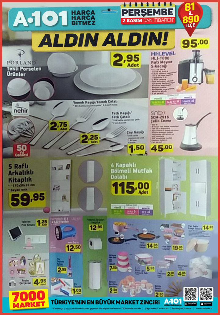 A101 2 Kasım 2017 tarihli aktüel ürünler kataloğu detaylı incelememize 2.broşür sayfası ile şimdilik sonlandırıyoruz. Porland tekli porselen ürünleri satışa sunan a101 market Nehir tatlı kaşığı/tatlı çatalı uygun fiyata müşterilerine sunmaya devam ediyor.