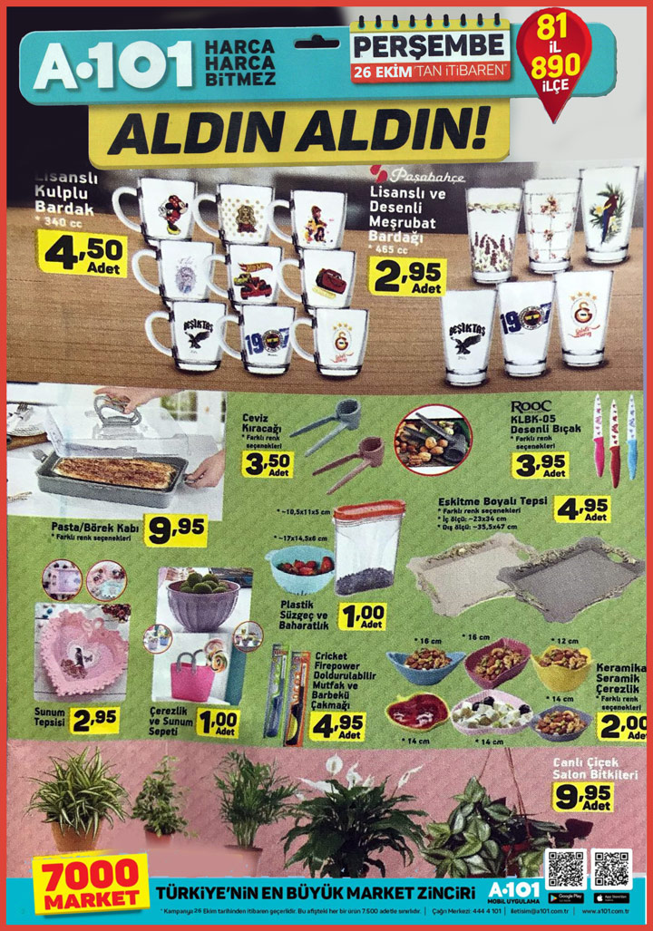 A101 26 Ekim perşembe kataloglarında görüldüğü gibi harika indirimler yer alıyor. Sosyal medyada çok konuşulan bu ürünlerin neler olduğuna dair kısa bir inceleme ile karşınızdayız. A101 marketlerinde yer alan ve müşterinin yüzünü güldüren harika ürünler var. A101 26 Ekim itibari ile sunacağı ürünlere bakacak olursak; Paşabahçe lisanslı kulplu bardak ilk olarak sizlerle. Diğer bir üründe Paşabahçe lisanslı ve desenli meşrubat bardağı yer alıyor. Ayrıca bu hafta 26 ekim itibari ile ve sınırlı stoklarla Pasta/börek kabı, Ceviz kıracağı, Rooc KLBK-05 desenli bıçak gibi ürünler de geliyor. Tam anlamı ile mutfak ürünleri sayfası olarak nitelenebilen sayfada Sunum tepsisi 2,95 TL gibi muhteşem bir fiyata sahip. Devam edelim… Çerezlik ve sunum sepeti inanılmaz fiyatı ile gelirken Plastik süzgeç ve baharatlık de bu fiyattan geri kalmıyor. Ayrıca Cricket Firepower doldurulabilir mutfak ve barbekü çakmağı da sizlerle. Devamında ise Eskitme boyalı tepsi, Keramike seramik çerezlik ve son olarak ise evinizin havasını değiştirecek güzel ve hoş bir ürün Canlı çiçek salon bitkileri 9,95 TL olarak sizlerle. A101 market sosyal medyayı sallamaya devam ederken muhteşem indirimleri için şimdiden alışveriş listeleri hazır… A101 26 ekim sunacağı ürünler için müşterileri listelerini hazır etti bile… Teşekkürler A101 Market…