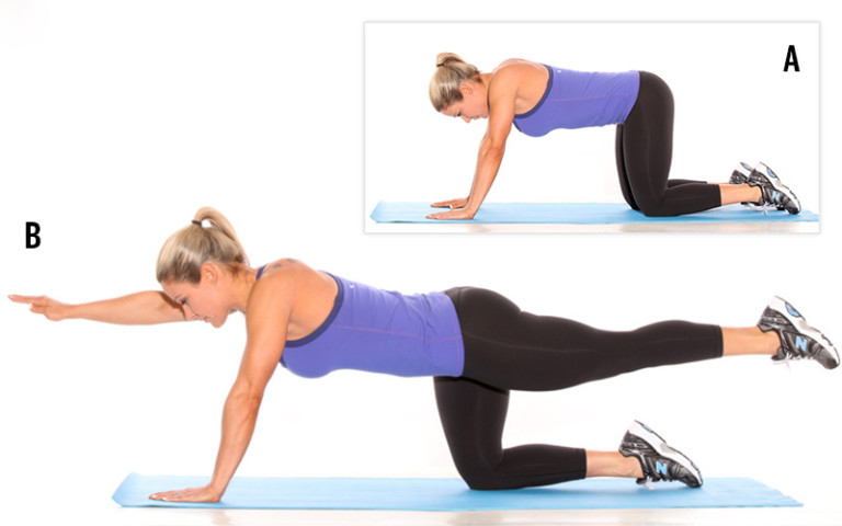 Sonrasında sol kolunuzu ve sağ bacağınızı yerden kaldırın ve bu pozisyonda 3-4 saniye kadar durun. Ardından başlangıç pozisyonunuza geri dönerek aynı hareketi sağ kol ve sol bacağınız için tekrarlayın. Bu egzersizi her iki tarafınız için de 5’er kez tekrarlayın.