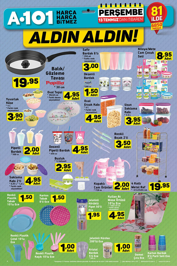 A101 13 temmuz aktüel ürün kataloglarında yer alan indirimlerde muhteşem fırsatlar var. Papilla Balık / Gözleme Tavası ile başlayan fırsatlarda neler var tek tek inceleyelim. Bu haftanın önemli a101 ürünlerine bakalım. Safir bardak 6’lı 3ürünü ile gelen sayfada Niloya / mete cam çocuk seti de yer alıyor. Ek olarak oval tepsi, esenli bardak, yuvarlak kase ve oval erzak kabı da satmayı planlayan market daha fazlası ile devam etmiş. A101 aktüel ürün katalogları yeni indirimlerinde uzun saklama kabı da satmayı planlayan market 13 temmuz günü pipetli bardak, esenli pipetli bardak, renkli bıçak 2’li ürünlerini de sayfasına eklemiş. A101.com.tr’den edinilen bilgiye göre: saklama kabı 2’li, buzluk, kapaklı cam ürünler ve son olarak, 4 katlı metal raf ürünü de sizlerle. A101 aktüel ürün kataloglarında yer alan 13 temmuz fırsatlarında ayrıca ve farklıca yer alan diğer indirimleri de inceledik. Daha fazlası için incelemelerimize bakabilirsiniz. Bağımsız olarak şeffaf biçimde ürünleri incelemeye devam edelim.