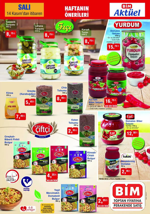 Bu hafta BİM Aktüel incelememizi 14 Kasım Salı tarihinde satışa sunulacak ürünleri sizler için inceledik. Fıçı Salatalık Turşusu 2550g 8,75 TL, Fıçı Lahana Turşusu 2500g 8,75 TL, Fıçı Karşık Turşu 2500g 8,75 TL, Yurdum Domates Salçası 4500g 15,75 TL, Yurdum Acı / Tatlı Biber Salçası 2900g 16,75 TL, Tat Domates – Biber Salçası 1700g 12,50 TL, Tukaş Rendelenmiş Domates 950g 2,95 TL, Çiftçi Kinoa 250g 7,45 TL, Çiftçi Greçka (Karabuğday) 500g 5,45 TL, Çiftçi Chia Tohumu 500g 8,95 TL, Çiftçi Keten Tohumu 500g 2,95 TL, Çiftçi Greçkalı – Biberli Firikli 360g 4,35 TL, Çiftçi Kinoalı – Chialı Bulgur 360g 4,35 TL, Çiftçi Yeşil Mercimekli – Domatesli Bulgur 360g 2,95 TL’den satışa sunulacaktır.