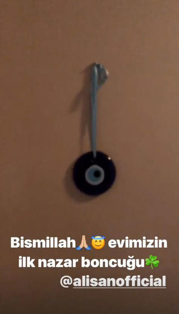 Buse Varol, Instagram’ın hikaye kısmında paylaştığı bu kareye “Bismillah evimizin ilk nazar boncuğu” notunu düştü.