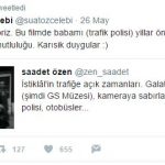 Siyasal iletişim danışmanı Osman Suat Özçelebi, Twitter’da “İstiklal’in trafiğe açık zamanları. Galatasaray’daki postane (şimdi GS Müzesi), kameraya sabırla dayanan trafik polisi, otobüsler…” notuyla gördüğü tweet’i, “Bu filmde babamı (trafik polisi) yıllar öncesinde görmenin şaşkınlığı ve mutluluğu. Karışık duygular” notuyla paylaştı. Özçelebi, yaşadığı güzel tesadüfün hikâyesini, babasını ve ardındaki o sımsıcak hikâyeyi anlattı. Videoyu paylaşan Saadet Özen’in kuzeninin eşi, aynı zamanda sınıf arkadaşı olduğunu söyleyen Özçelebi, “Bana videonun linkini gönderdi. O videonun aslı 10 dakikalık bir Fransız filmi ya da belgeseliymiş. Galatasaray’da yıllarca trafik polisliği yapan babam da filme denk gelmiş” dedi.