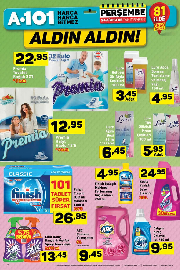A101 fırsat ürünleri incelememizde 24 Ağustos tarihli kataloğun bu broşür sayfasında temizlik ürünlerine ağırlık verilmiş. Premia Tuvalet Kağıdı 32’li 22,95 TL, Lure Roll-on Sir Ağda Çeşitleri 100ml 3,45 TL, Lure Ağda Sonrası Temizleme ve Masaj Yağı 150ml 4,95 TL, Premia Kağıt Havlu 12’li 12,95 TL, Lure Ağda Bezi 25m 6,45 TL, Lure Tüy Dökücü Krem Çeşitleri 100ml 5,95 TL, Finish Classic Bulaşık Makinesi Tableti 101’li 26,95 TL, Finish Bulaşık Makinesi Performans Güçlendirici 250ml 4,95 TL, Kosla Vanish Leke Çıkarıcı 3,6 Litre 24,95 TL, Cillit Bang Banyo & Mutfak Sprey Temizleyici 2x750ml 13,45 TL, ABC Çamaşır Yumuşatıcı 5 Litre 9,95 TL, Calgon Kireç Önleyici Jel 750ml 9,95 TL’den satın alabilirsiniz.