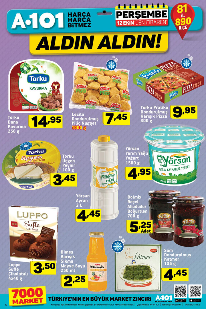 A101 12 ekim 2017 Perşembe Aldın Aldın kataloğu aktüel fırsatlarını incelemeye devam ediyoruz. Bu hafta A101’in gıda ürünlerinde yaptığı indirimlerin yer aldığı görsel sayfasını inceleyeceğiz. Bakalım hangi fırsatlar A101’de indirimde görelim. İlk olarak Torku dana kavurma 250gr indirime girmiş. Diğer bir üründe Lezita dondurulmuş piliç nugget 1000gr ürünü indirime alınan ürünler arasında göze çarpıyor. Fiyatları gerçektne iyi olan ürünleri ve görselde yer alan ürünleri incelemeye devam edelim. Torku Pratiko dondurulmuş karışık pizza 300gr ürününde kaçırılmaz bir fiyat var. Torku Üçgen peynir 100gr ve Yörsan ayran 2lt ürünü de A101 tarafından indirime giren ürünler arasında karşımıza çıkıyor. Yörsan yarım yağlı yoğurt 1500gr ile devam eden fırsatlarda Luppo suffşe çikolatalı 4x40gr de indirimli olarak geliyor. Ek olarak Bolmix reçel ahududu/böğürtlen 700gr, Dimes karışık meyve suyu 250ml de sizlerle. Son olarak ise Sam dondurulmuş katmer 135gr ürünü A101 tarafından indirimli olarak sunulmuş. A101 gıda aldın aldın aktüel fırsatlarını inceledik. Daha fazlasını A101’den görebilirsiniz. İncelemelerimize yansımayan kısım için şimdiden özür dileriz. Belirtirseniz onları da inceleriz.