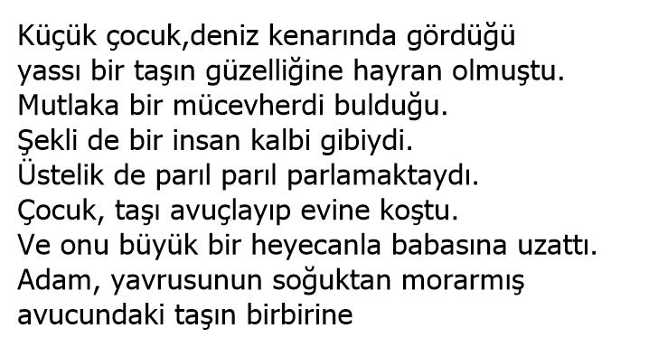 Köy kahvesinde oturan adam erkek bebeği olduğu haberini alınca mutluluktan havalara uçarak kahveciye “Herkese benden çay heyt be oğlum oldu” diye seslendi. Sonra da büyük bir mutluluk içinde koşarak eve geldi. Bu arada kadın da henüz bebeği görememişti. Adam geldikten sonra hemen bebeği sordu “Nerde oğlum oğlumu getirin bana” diye mutluluk içerisinde bağırıyordu.