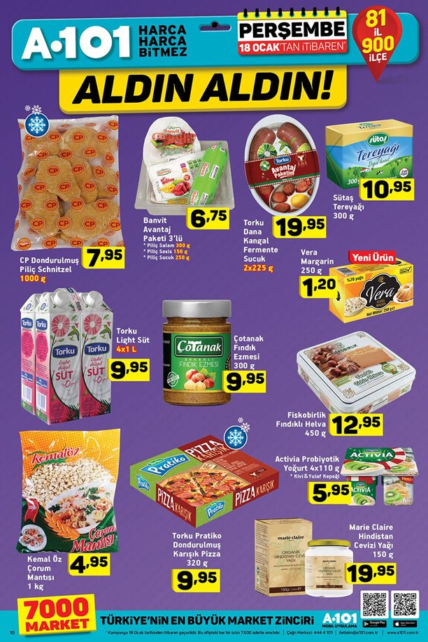 A101 8 Şubat 2018 kataloğu detaylı incelememize 8. broşür sayfası ile karşınızdayız. CP Dondurulmuş Piliç Schnitzel 1000g 7,95 TL, Banvit Avantaj Paketi 3’lü 6,75 TL, Torku Dana Kangal Fermente Sucuk 2x225g 19,95 TL, Sütaş Tereyağı 300g 10,95 TL, Vera Margarin 250g 1,20 TL, Torku Light Süt 4×1 Litre 9,95 TL, Çotanak Fındık Ezmesi 300g 9,95 TL, Fiskobirlik Fındıklı Helva 450g 12,95 TL, Activa Probiyotik Yoğurt 4x110g 5,95 TL, Kemal Öz Çorum Mantısı 1 kg 4,95 TL, Torku Pratiko Dondurulmuş Karışık Pizza 320g 9,95 TL, Marie Claire Hindistan Cevizi Yağı 150g 19,95 TL’den raflarda yerini almaktadır.