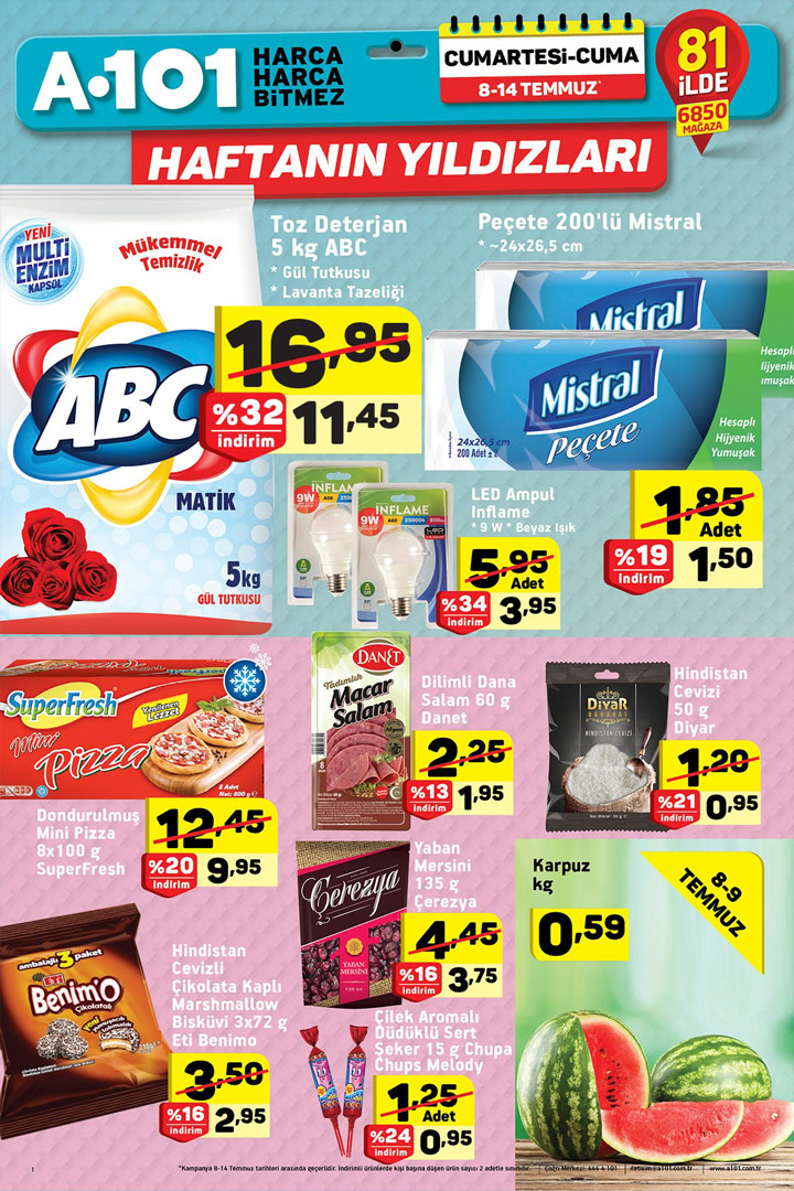 A101 8 Temmuz hafta sonu kataloglarında indirime doyuruyor. A101 hafta sonu indirimleri 8 temmuz & 14 temmuz kataloglarında muhteşem fırsatlar yer almış. Peki neler var ve yüzde kaç indirimli, detayları görelim. Abc toz deterjan 5kg ürünü %32 indirimli olarak sizlerle buluşturulmuş. Mistral peçete 200’lü ürünü için de %19 indirim uygulanmış olarak sunulmuş. Peki Inflame LED ampul , bu üründe de %34 indirim var. Gerçekten süper. SuperFresh dondurulmuş mini pizza 8x100gr ürünü de %20 indirimli fiyatı ile çok konuşuluyor. Bu sayfada Danet dilimli dana salam 60gr %13 indirimli olarak gelirken Dilyar Hindistan cevizi 50gr %21 indirimli olarak sizlerle. Eti Benimo Hindistan cevizli çikolata kaplı marshmallow bisküvi 3x72gr ürünü de %16 indirimli olarak sizlerle. A101 market aktüel ürünlerinde 8 temmuz fırsatlarında Çerezya yaban mersini 135gr %16 indirimli olarak sizlerle buluşuyor. Cuoa Chuos Melody çilek aromalı düdüklü sert şeker 15gr %16 indirimli olarak ve son olarak ise Karpuz 0,59 TL (kg- 8-9 Temmuz tarihlerinde geçerlidir) sunulmuş.