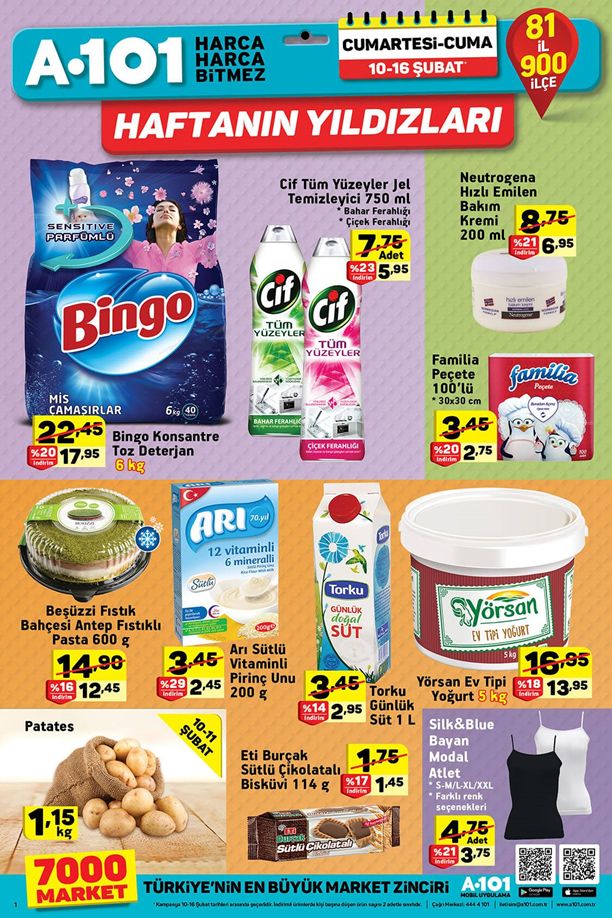 A101 10 Şubat 2018 tarihli haftanın yıldızları kataloğu detaylı incelememize 9. broşür sayfası ile sürdürüyoruz. Bingo Konsantre Toz Deterjan 6 Kg 17,95 TL, Cif Tüm Yüzeyler Jel Temizleyici 750 ml 5,95 TL, Neutrogena Hızlı Emilen Bakım Kremi 200 ml 6,95 TL, Beşüzzi Fıstık Bahçesi Antep Fıstıklı Pasta 600g 12,45 TL, Arı Sütlü Vitaminli Pirinç unu 200g 2,45 TL, Torku Günlük Süt 1 Litre 2,95 TL, Yörsan Ev Tipi Yoğurt 5 Kg 13,95 TL, Patates 1,15 TL (10-11 Şubat’ta), Silk&Blue Bayan Modal Atlet 3,75 TLden A101’lerde.