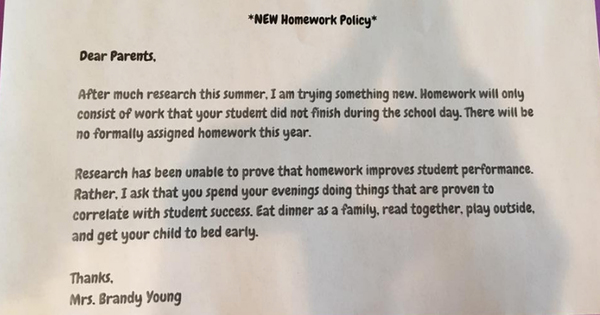 Teksaslı öğretmen Brandy Young okullardan başlamadan hemen önce öğrencilerine hiç beklenmedik bir mesaj verdi. Öğretmen yıl boyunca kimseye ev ödevi vermeyeceğini açıkladı. Bunun yerine öğretmen, daha başarılı bireyler olmaları için ailelerden çocuklarıyla daha fazla vakit geçirmesini istedi.
