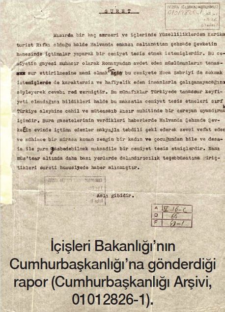 “Mısır’da birkaç serseri ve içlerinde Yüzelliliklerden Karikaturist Rıfkı olduğu halde Helvan’da enkaz-ı saltanattan (saltanat enkazından) Şehzade Şevket’in hânesinde ictimalar yaparak (toplanarak) bir cemiyet tesis etmek istemişlerdir. Bu cemiyetin gayesi muhacir olarak Romanya’dan avdet eden Müslümanlar’ın tanassur ettirilmesine (Hristiyan yapılmalarına) mani olmaktır. Bu cemiyete Hoca Sabri’yi de sokmak istemişlerde de, karaktersiz ve hafiyelik eden insanlarla çalışamayacağını söyleyerek cevab-ı red vermiştir. Bu münafıklar Türkiye’de tanassur keyfiyeti (Hristiyanlaştırma durumu) olmadığını bildikleri halde bu maksatla cemiyet tesis etmeleri sırf Türkiye aleyhine cahil ve mutaassıp Mısır muhitinde bir cereyan uyandırmak içindir. Bura gazetelerinin verdikleri haberlerde Helvan’da Şehzade Şevket’in evinde ictima edenler makyajla tebdil-i şekl ederek (şekil değiştirerek) zevci vefat eder ve mühimce bir mirasa konan zengin bir kadın ve çocuğundan hile ve desâis (hileler) ile para gasbedebilmek maksadıyla bir cemiyet tesis etmişlerdir. Nam-ı müstear altında daha bazı yerlerde dolandırıcılık teşebbüsatına giriştikleri suret-i hususiyede )özel surette) haber alınmıştır”.