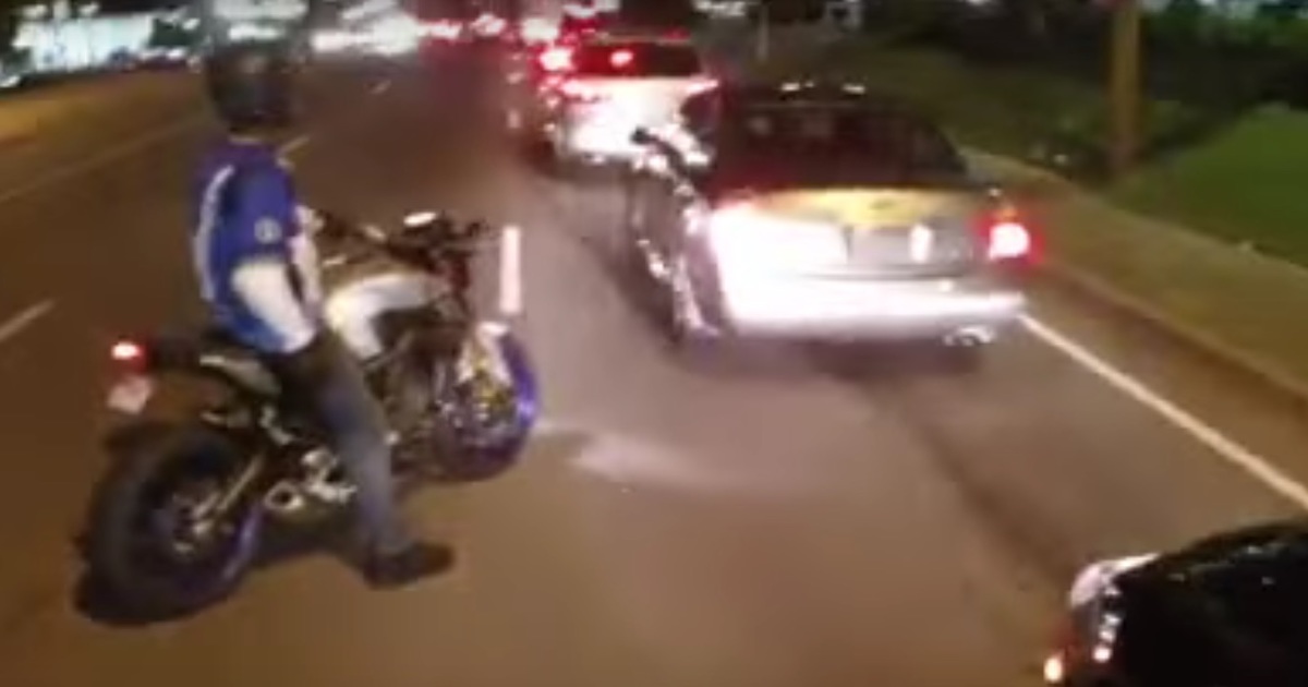GoPro ile yapılan çekimde, Tennessee’nin Nashville semtinde yolda seyir halinde olan iki motorsikletli görünüyor. Kırmızı ışıkta durdular ve kadına ön cam penceresini indirmesini söylediler. Motorsikletlilerden biri kadına, aracının altına kamyondan düşen uzun ve geniş bir kartonun yapıştığını söyledi.