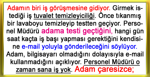 “Peki, Bilal” dedim, “Bu zamanda işe girmek zor, hem de çok zor! Senin torpilin var mı? Referansın kim? İşe nasıl gireceksin?”