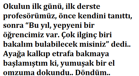Adı okundu, içeri girdi. Heyecandan olacak, bizi birden fark edemedi, zaten kıyafetlerimiz de değişmişti. Biz susmuştuk, o da başını yavaş yavaş kaldırarak bize baktı.