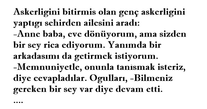 Askerliğini bitirmiş olan genç askerliğini yaptığı şehirden ailesini aradı: -Anne baba, eve dönüyorum, ama sizden bir şey rica ediyorum. Yanımda bir arkadaşımı da getirmek istiyorum. -Memnuniyetle, onunla tanışmak isteriz, diye cevapladılar.Oğulları, -Bilmeniz gereken bir şey var diye devam etti. -Arkadaşım savaşta ağır yaralandı.Bir mayına bastı ve bir koluyla ayağını kaybetti. Gidecek hiçbir yeri yok, ve