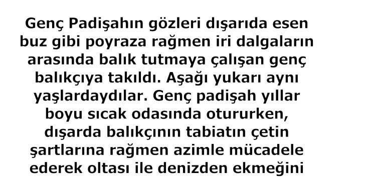 Genç Padişahın gözleri dışarıda esen buz gibi poyraza rağmen iri dalgaların arasında balık tutmaya çalışan genç balıkçıya takıldı. Aşağı yukarı aynı yaşlardaydılar. Genç padişah yıllar boyu sıcak odasında otururken, dışarıda balıkçının tabiatın çetin şartlarına rağmen azimle mücadele ederek oltası ile denizden ekmeğini çıkarışını seyrederdi. Balıkçıya için için gizli bir hürmet besliyordu. Yıllar silinmez izler bırakarak