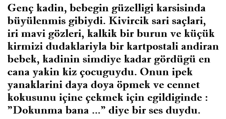 Genç kadın, bebeğin güzelliği karşısında büyülenmiş gibiydi. Kıvırcık sarı saçları, iri mavi gözleri, kalkık bir burun ve küçük kırmızı dudaklarıyla bir kartpostalı andıran bebek, kadının şimdiye kadar gördüğü en cana yakın kız çocuğuydu. Onun ipek yanaklarını daya doya öpmek ve cennet kokusunu içine çekmek için eğildiğinde : “Dokunma bana …” diye bir ses duydu. “Beni