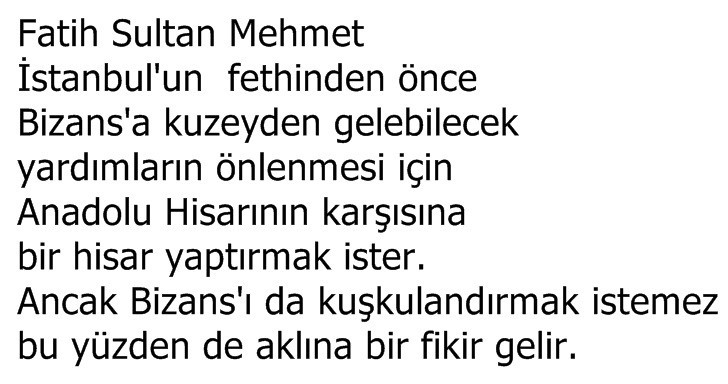 Fatih Sultan Mehmet İstanbul’un fethinden önce Bizans’a kuzeyden gelebilecek yardımların önlenmesi için Anadolu Hisarının karşısına bir hisar yaptırmak ister. Ancak Bizans’ı da kuşkulandırmak istemez bu yüzden de aklına bir fikir gelir. Bizans İmparatorundan av köşkü yaptırmak için toprak ister. İmparator aralarındaki barışı bozmamak için elçiyle şöyle bir haber gönderir “Eğer padişah bir sığır derisinin kapladığı