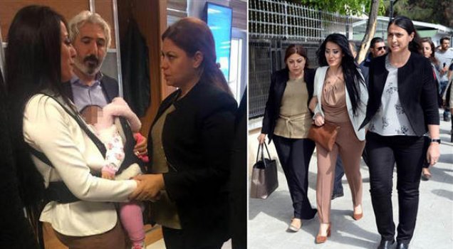 Ayşe Çelik (ortada) adliyeden ayrılırken bir elinden CHP Milletvekili Zeynep Altıok (solda), diğer elinden ise HDP Milletvekili Feleknas Uca’nın tuttuğu görüldü.