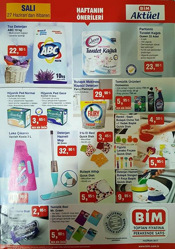 Salı gününden itibaren BİM Market 27 Haziran 2017 fırsat ürünleri broşüründe temizlik ürünleri cazip fiyatları ile yer alıyor. ABC Toz Deterjan 10 Kg 22,90 TL, Queen Parfümlü Tuvalet Kağıdı 32 Adet 23,90 TL, Scarlett Hijyenik Ped Normal 3,65 TL, Scarlett Hijyenik Ped Gece 3,65 TL, Fairy Platinum Bulaşık Makinesi Kapsül Deterjan 51’li 29,90 TL, Domestos Temizlik Ürünleri 5,95 TL, Vanish Kosla Leke Çıkarıcı 3 Litre 19,90 TL, Mr.Green Deterjan Hazneli Mop 32,90 TL, Quick Dish 3’lü El Bezi 3,45 TL, Quick Dish Renkli – Saplı Bulaşık Ovma Teli + 1 Yedek Başlık 4,50 TL, Quick Dish Figürlü Lavabo Fırçası 5,95 TL, Quick Dish Bulaşık Altlığı 5,95 TL, Quick Dish Deterjan Hazneli Bulaşık Süngeri + 1 Fırça Başlık 9,95 TL, Mr.Green Oto Temizleme Bezi 36 Adet 2,95 TL, Mr.Green Temizlik Bezi 5,90 TL gibi fiyatlara bim marketlerinden satın alabilirsiniz.