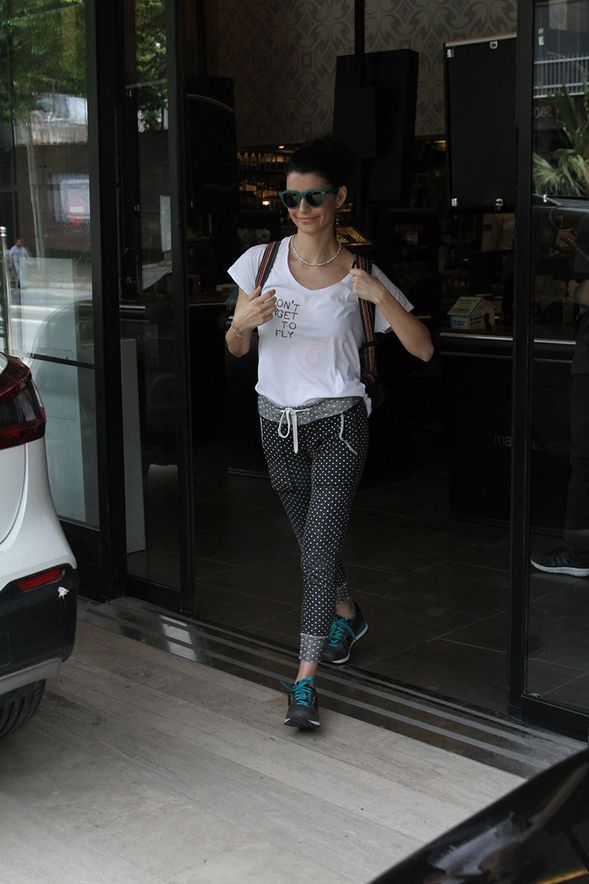 Beren Saat’in Puantiyeli eşofmanın üzerine giydiği tişörtte ‘Don’t forget to fly’ (Uçmayı unutma) yazıyordu.