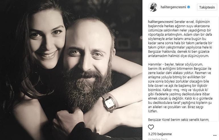“Seneler evvel, ilişkimizin başlarında herkes ağzının suyu akarcasına üstümüze saldırırken neler yaşadığımızı bir röportajda anlatmıştım. Adam olan bir defa söylemeyle anlar kelamı ama bugün bu kadar sene sonra hala bir takım yerlerde bir takım çirkin yakıştırmalar yapılıyorsa hele ki Bergüzar hakkında, demek ki ben güzelce anlatamadım halimizi diye düşünüyorum.