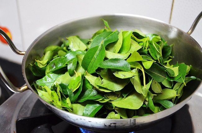 Bir yemek kaşığı Hindistan Cevizi yağında bir avuç içi kadar köri yaprağını kaynatın. Daha sonra yağını süzün ve soğutmaya bırakın.