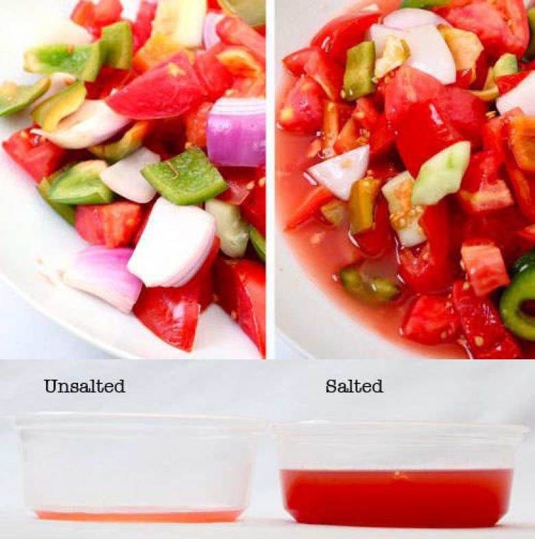 Tek yapmanız gereken salataya her zamankinden biraz daha tuz atmak. Bu şekilde domatesler suyunu daha çabuk bırakacaktır.