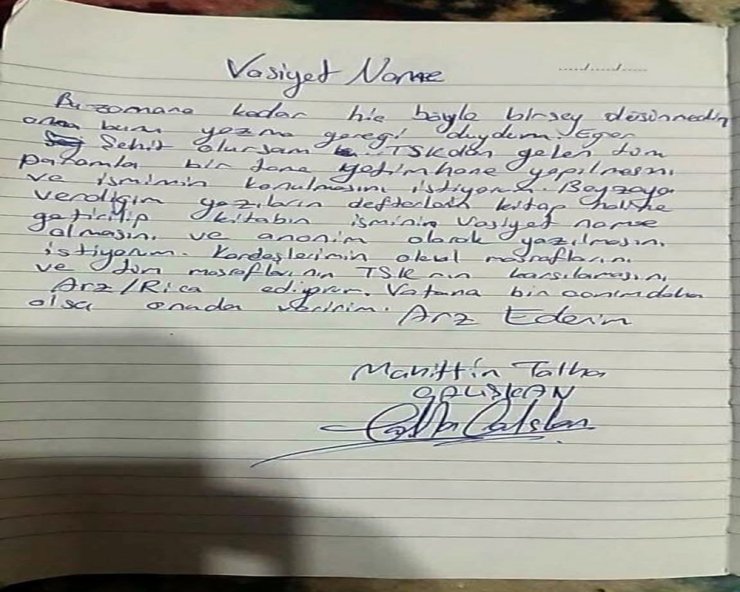 Suriye’nin Afrin bölgesinde teröristler tarafından tuzaklanan el yapımı patlayıcının patlaması sonucu şehit olan Piyade Sözleşmeli Er Muhittin Talha Çalışkan’ın el yazısı ile yazdığı vasiyet ortaya çıktı.
