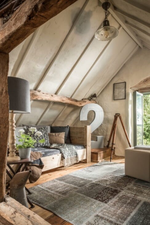 Kır evinde retro ve modern tarz sayesinde değişik bir hisse kapılıyorsunuz. Üst kata çıktığınızda bir koltuk ve kitaplık görüyorsunuz.,