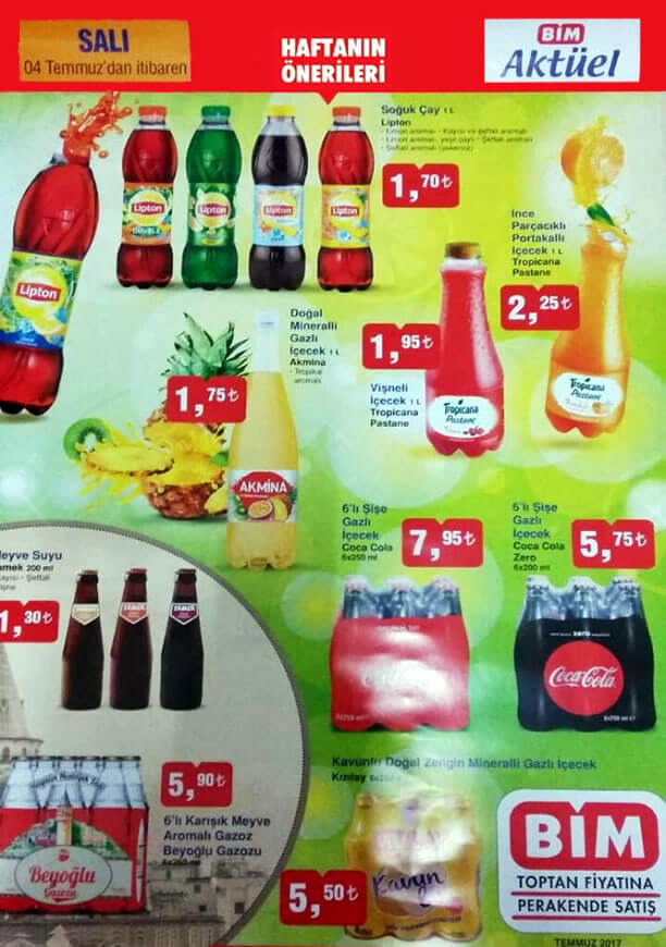 4 Temmuz 2017 Salı gününden itibaren geçerli olacak fırsat ürünleri incelememize başlıyoruz. Lipton Soğuk Çay 1 Litre 1,70 TL, Akmina Doğal Mineralli Gazlı İçecek 1 Litre 1,25 TL, Tropicana Pastane Vişneli İçecek 1 Litre 1,95 TL, Tropicana Pastane İnce Parçacıklı Portakallı İçecek 1 Litre 2,25 TL, Tamek Meyve Suyu 200ml 1,30 TL, Beyoğlu Gazozu Karışık Meyve Aromalı Gazoz 6’lı 5,90 TL, Coca Cola Şişe Gazlı İçecek 6x250ml 7,95 TL, Coca Cola Zero Şişe Gazlı İçecek 6x250ml 5,75 TL, Kızılay Kavunlu Doğal Zengin Mineralli Gazlı İçecek 6x200ml 5,50 TL gibi fiyatlara bim market raflarında satışa sunulmaktadır.