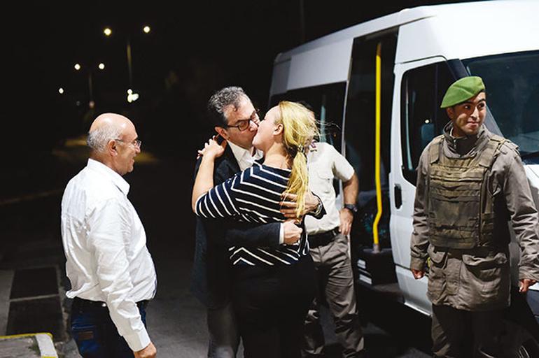 25 Eylül Pazartesi… Yer Çağlayan Adliyesi… Cumhuriyet gazetesi yönetici ve yazarlarının da arasında bulunduğu 6’sı tutuklu 20 sanığın yargılandığı davanın üçüncü duruşması… Yine saatler sürüyor. Tanıklar dinleniyor, herkes nefesini tutmuş, içeriden gelecek tahliye haberlerini bekliyordu. Haber, eksik de olsa geldi. Gazetenin yazarlarından, yayın danışmanı da olan Kadri Gürsel için tahliye kararı verildi. Kadri Gürsel, 330 gün sonra gece yarısı Silivri Cezaevi’nden çıktı. Ve o çıkış, öyle bir fotoğrafla kayda geçti ki, tüm Türkiye bunu konuştu. Fotoğrafta eşi Nazire Kalkan Gürsel ve kendisi vardı. Büyük bir aşk ve özlemle öpüşüyorlardı. İhtiyacımız olan samimiyet ve sevgi cezaevi önünden bir fotoğrafla bize de sirayet etti. Arada eleştirenler oldu ama hepimize iyi geldi, sosyal medyada fotoğraf altına ‘Bizi aşk kurtaracak’ diye yorumlar yazdık. Fotoğraf karesinde bir milletvekili; Mahmut Tanal ve mahcup bir tebessümle kafasını çevirerek, bir bakıma öpüşen çifte izin veren askeri de çok sevdik. Fotoğraf editörümüz Sebati Karakurt ile Kadri Gürsel, eşi Nazire Kalkan Gürsel ve oğulları Erdem’in evine konuk olduk. Bu aşkın hikâyesini de konuştuk, tutsaklık halini de… Not: Bir sonraki duruşma 31 Ekim’de… Bu sevinci diğer tutuklu meslektaşlarımız ve ailelerinin de yaşaması dileğiyle…