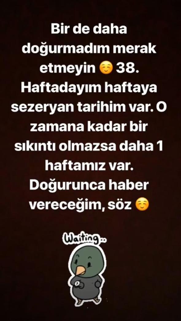 Doğumun bir hafta sonra gerçekleşeceğini söyleyen Buse Terim, paylaşımına; “Daha doğurmadım merak etmeyin. 38. haftadayım. Haftaya sezaryen tarihim var. O zamana kadar bir sıkıtnı olmazsa daha 1 haftamız var. Doğurunca haber vereceğim, söz” notunu düştü.