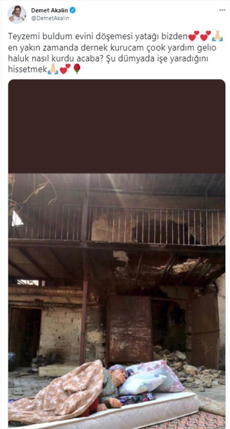 Yangın felaketinde hem sosyal medyada hem de yardım kuruluşları aracılığıyla yaraları sarmaya çalışan ünlü şarkıcı Demet Akalın, yangında kaybettiği evinin bahçesine attığı yatak üstünde uyuyan Fatma Öksüzoğlu bulmak için harekete geçmişti.