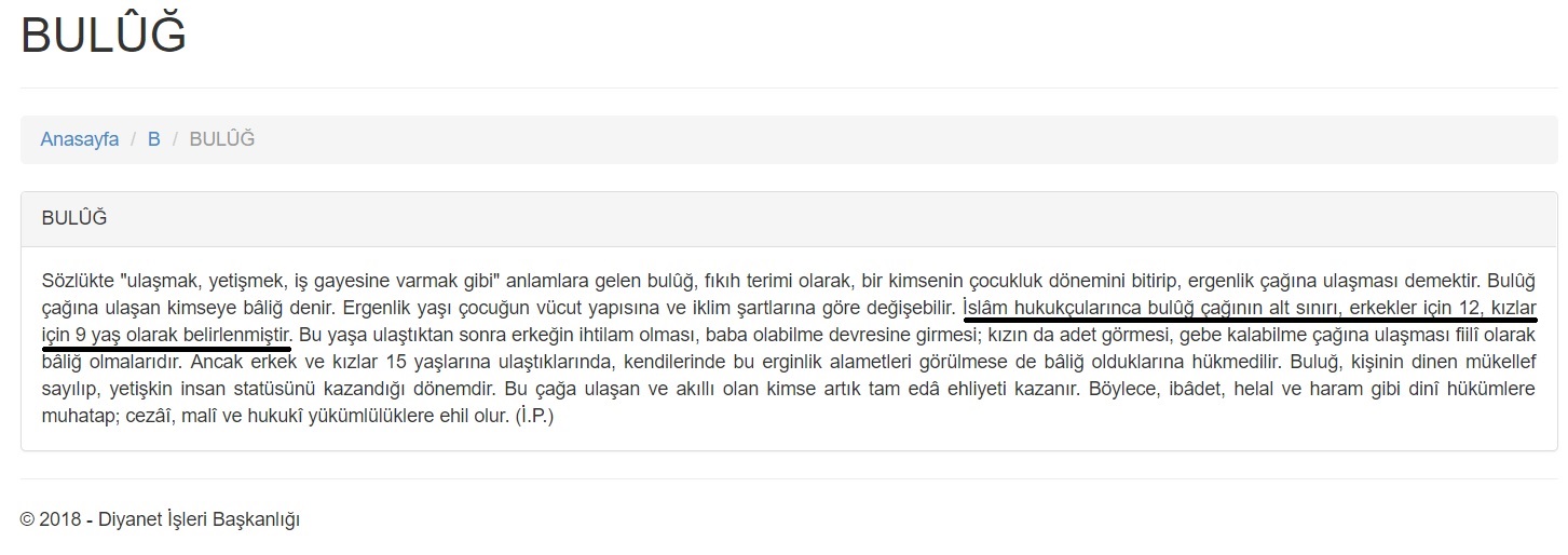 Diyanet’in resmi sitesinde nikah tanımı yaparak, bulûğ çağına girmiş olanların dinen nikahlanabileceğini, bulûğ yaşının alt sınırını kızlarda 9, erkeklerde 12 olarak belirttiği iddia edilmişti.