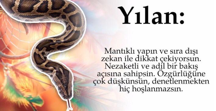 YILAN: Mantıklı yapın ve sıra dışı zekan ile dikkat çekiyorsun. Nezaketli ve adil bir bakış açısına sahipsin. Özgürlüğüne çok düşkünsün, denetlenmekten hiç hoşlanmazsın.