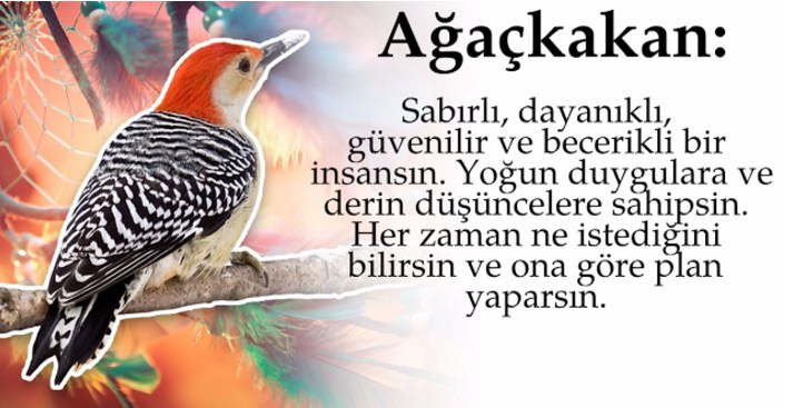 AĞAÇKAKAN: Sabırlı, dayanıklı, güvenilir ve becerikli bir insansın. Yoğun duygulara ve derin düşüncelere sahipsin. Her zaman ne istediğini bilirsin ve ona göre plan yaparsın.