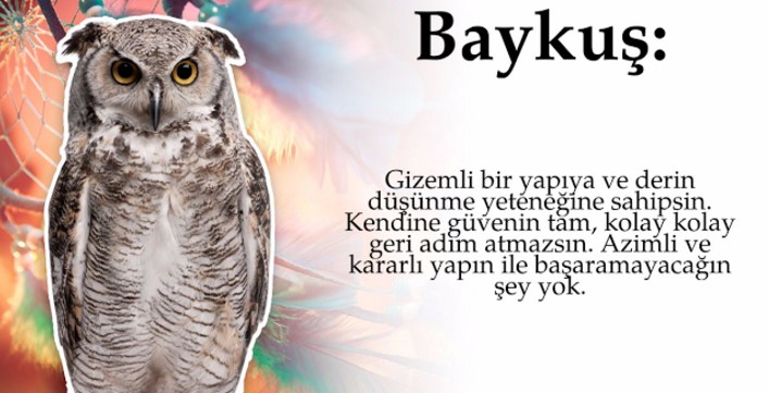 BAYKUŞ: Gizemli bir yapıya ve derin düşünme yeteneğine sahipsin. Kendine güvenin tam, kolay kolay geri adım atmazsın. Azimli ve kararlı yapın ile başaramayacağın şey yok.