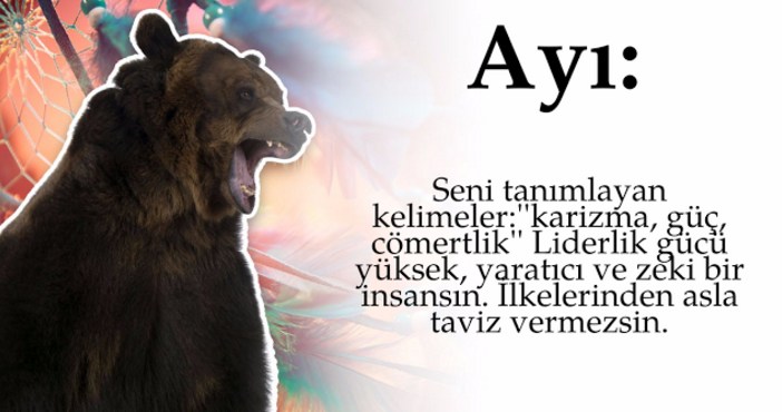 AYI: Seni tanımlayan kelimeler:”karizma,güç, cömertlik” Liderlik gücü yüksek,yaratıcı ve zeki bir insansın. İlkelerinden asla taviz vermezsin.