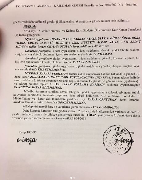 Adnan Oktar, Tarkan Yavaş, Didem Ürer, Bora Yıldız, Erkan Mamati, Mustafa Işık, Hüseyin Alpar Sayın, Cem Sedat Altan’ın 4 ay süre ile Ceylan Özgül’e karşı şiddet tehditi, hakaret aşağılama, küçük düşürmeyi içeren söz ve davranışlarda bulunmaması, konuta, okula, iş yerine yaklaşılmamasına, ileşitim araçlarıyla rahatsız edilmemesine yönelik karar çıktı.