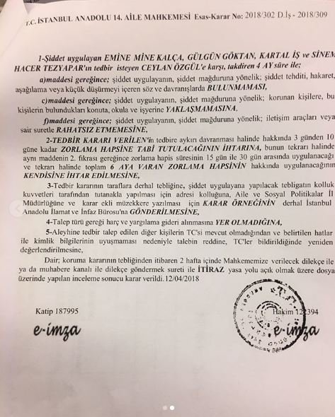 Mahkeme, 12 Nisan’da verdiği karar ile Emine Mine Kalça, Gülgün Göktan, Kartal İş, Sinem Hacer Tezyapar hakkında 4 ay süre ile Ceylan Özgül’e yanına yaklaşmama, hakaret etmeme kararı verildi.