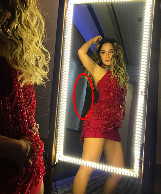 Modacı Fidan Şimşek’in atölyesinde kıyafet deneyen Özlem Yıldız, çektiği fotoğrafı Instagram’da paylaştı. Fotoğrafa photoshop uygulayan Özlem Yıldız, aynadaki yansımayı unutunca ortaya bu görüntü çıktı.